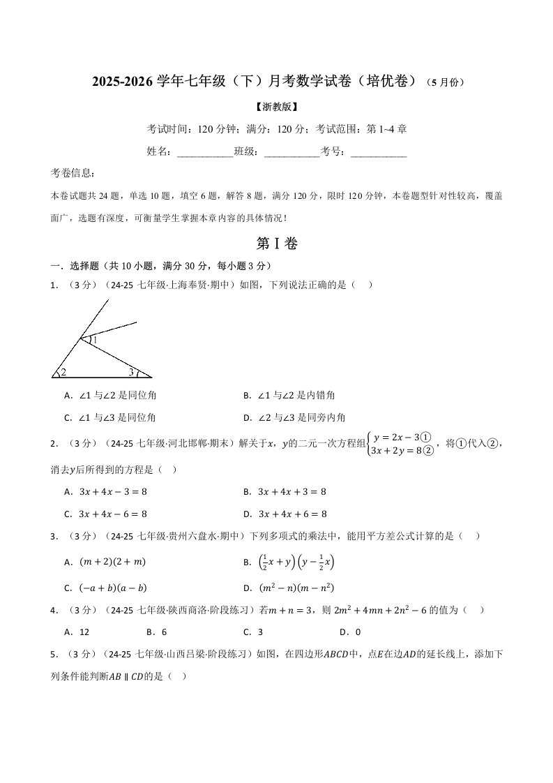 七年级(下)月考数学试卷(5月份)(培优卷)(考查范围:第1~4章)(浙教版)(含答案)QXSXZJ-0266