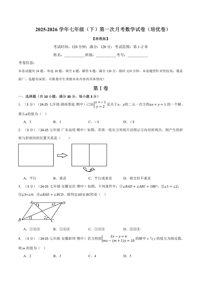 七年级(下)第一次月考数学试卷(3月份)(培优卷)(考查范围:第1~2章)(浙教版)(含答案)QXSXZJ-0261