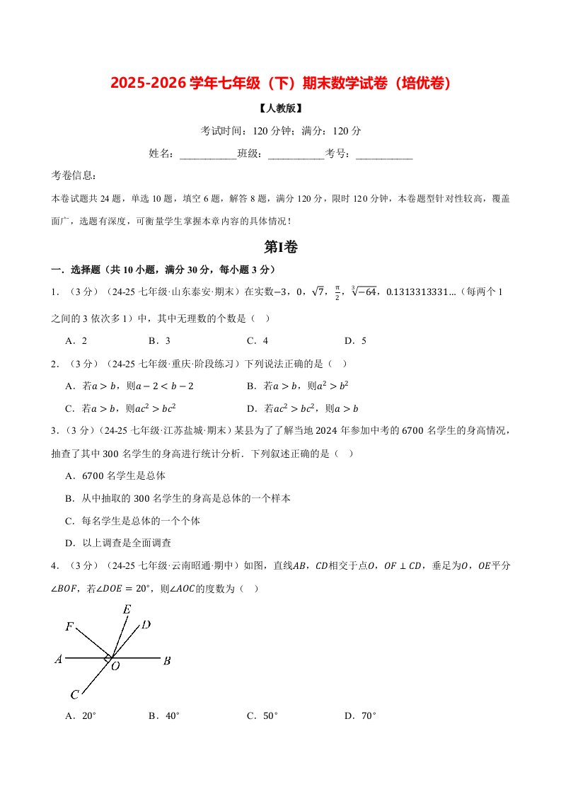 七年级(下)期末数学试卷(培优卷)(人教版)(含答案)QXSXRJ-0220