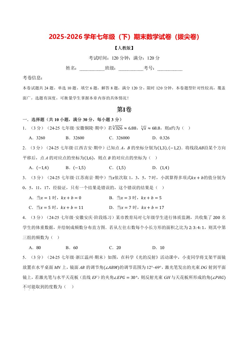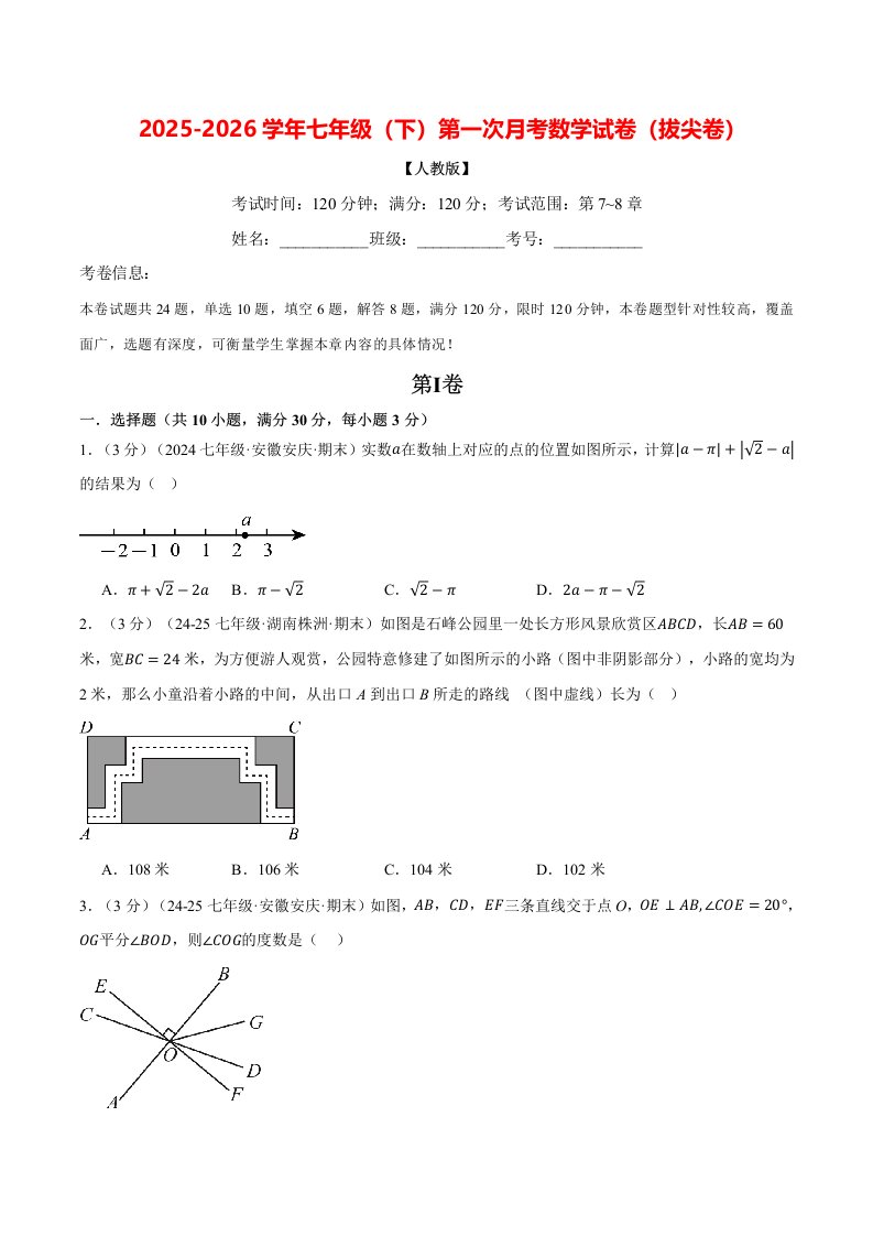 七年级(下)数学第一次月考数学试卷(3月份)(拔尖卷)(考查范围:第7~8章)(人教版)(含答案)QXSXRJ-0212