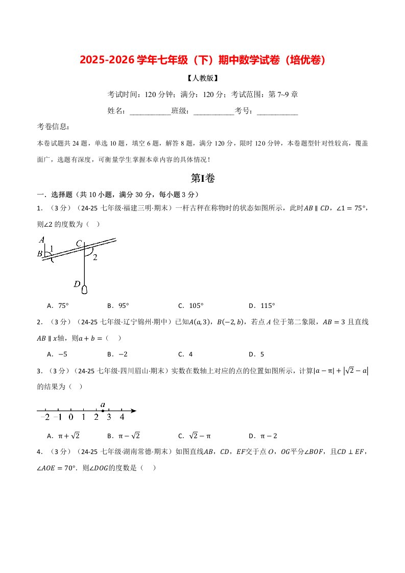 数学七年级(下)期中数学试卷(拔尖篇)(考查范围:第7~9章)(人教版)(含答案) QXSXRJ-0217