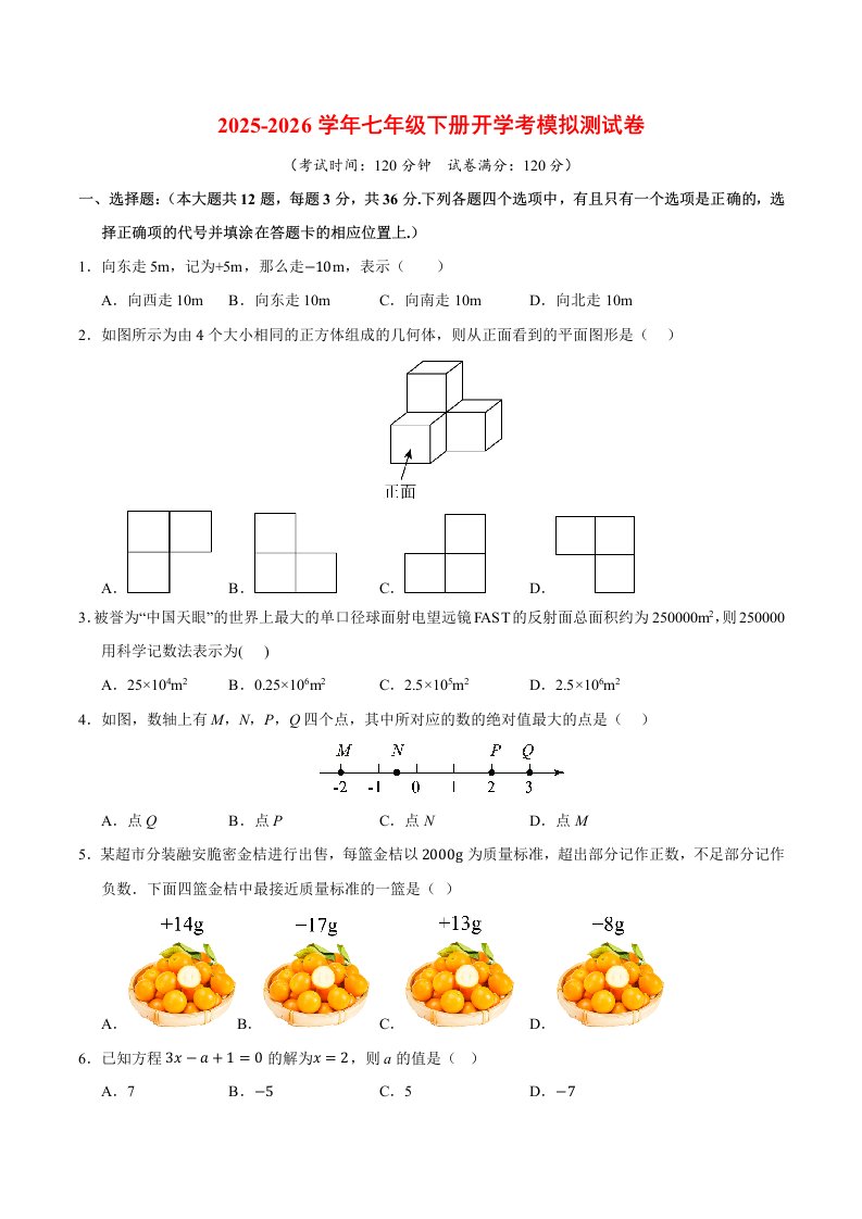 七年级开学考模拟测试卷(人教版专用)(考试版)QXSXRJ-0252