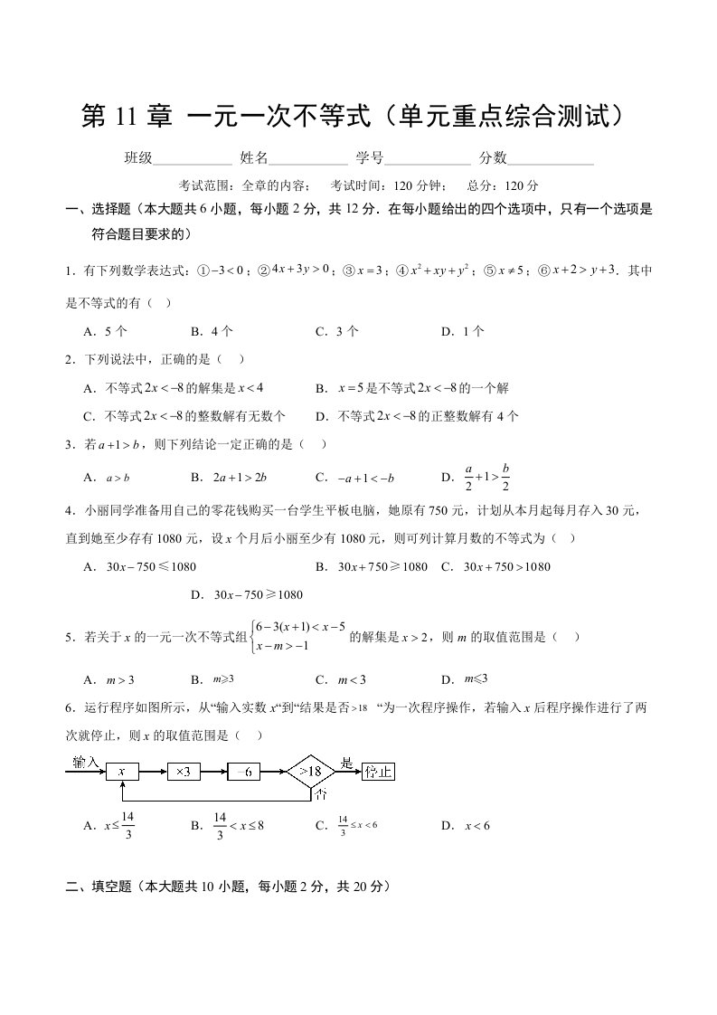 七下苏科数学 第11章 一元一次不等式(单元重点综合测试)(含答案)QXSXSK-0074