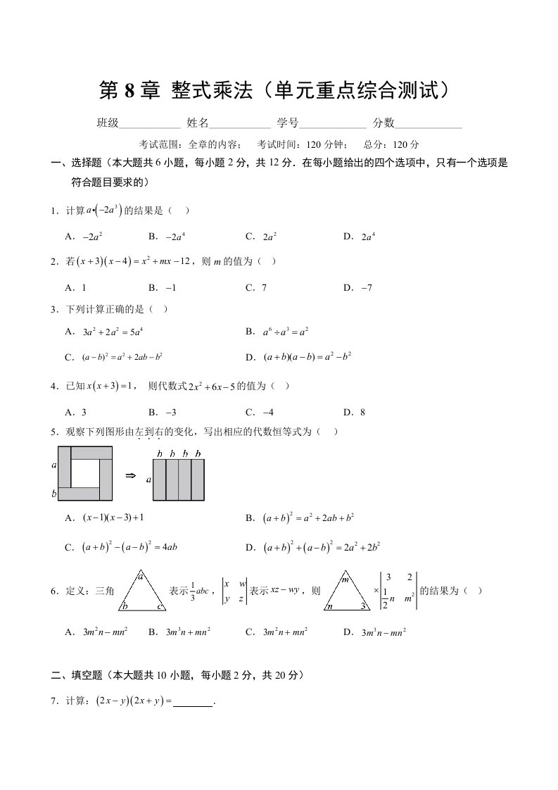 七下苏科数学 第8章 整式乘法(单元重点综合测试)(含答案)QXSXSK-0080