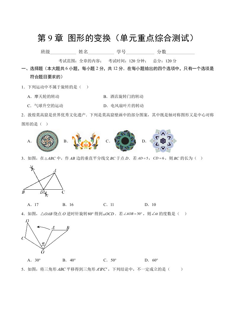 七下苏科数学 第9章 图形的变换(单元重点综合测试)(含答案)QXSXSK-0082