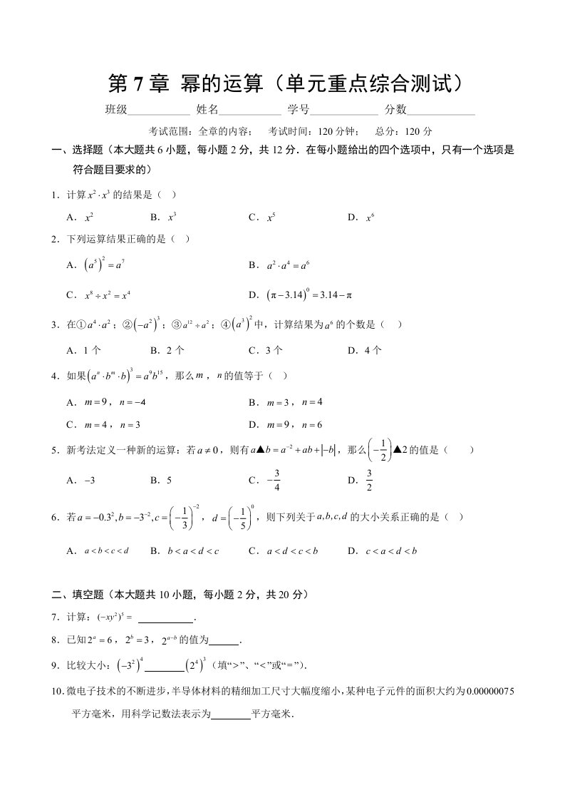 七下苏科数学 第7章 幂的运算(单元重点综合测试)(学生版)(含答案)QXSXSK-0078