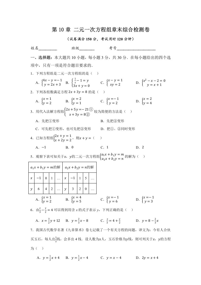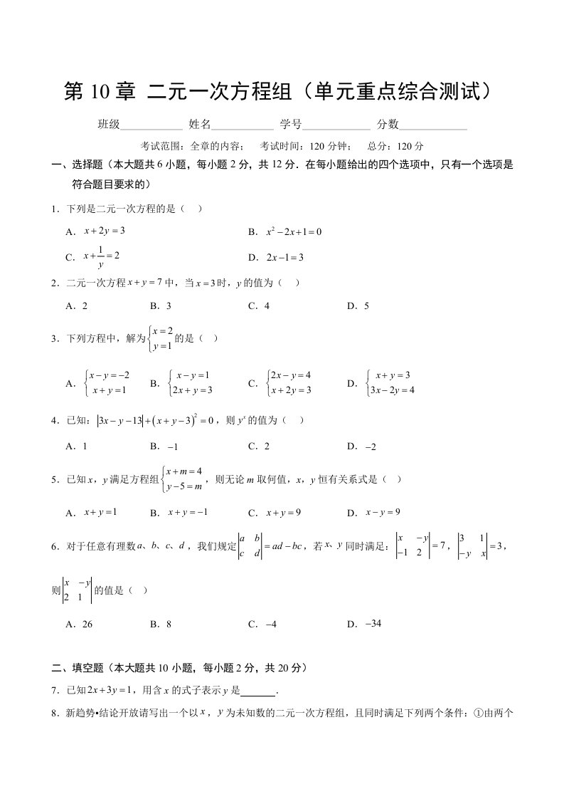 七下数学苏科 第10章 二元一次方程组章末综合检测卷(含答案)QXSXSK-0059