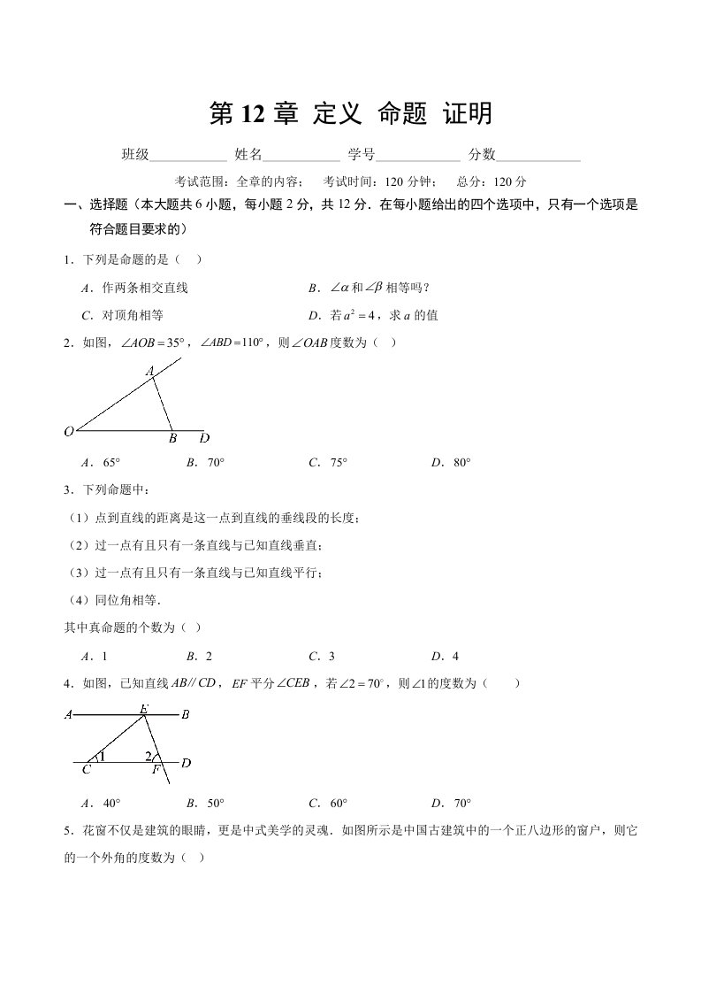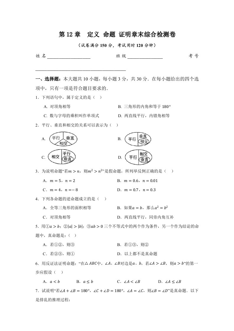 七下苏科数学 第12章 定义 命题 证明(单元重点综合测试)(含答案)QXSXSK-0076