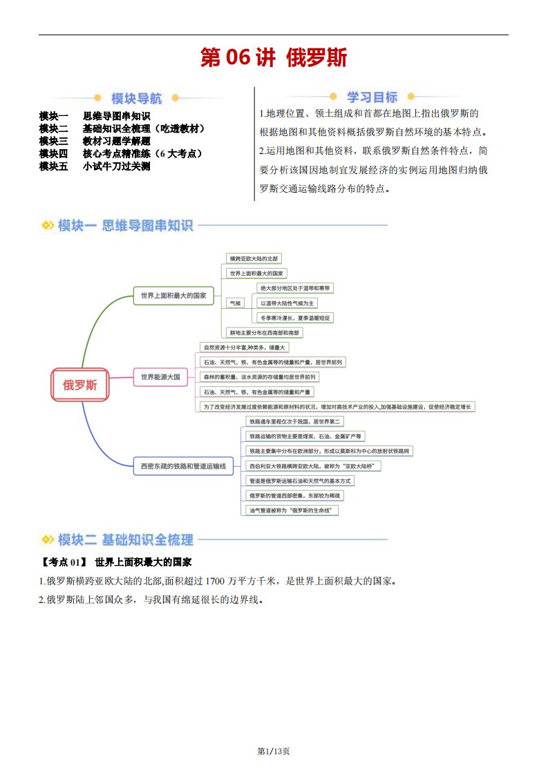 【七下人教地理】第06讲 俄罗斯(含答案)QXDLRJ-0147