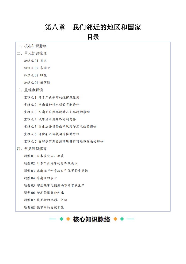 七下地理 第八章 我们邻近的地区和国家(知识清单)(含答案)QXDLRJ-0017