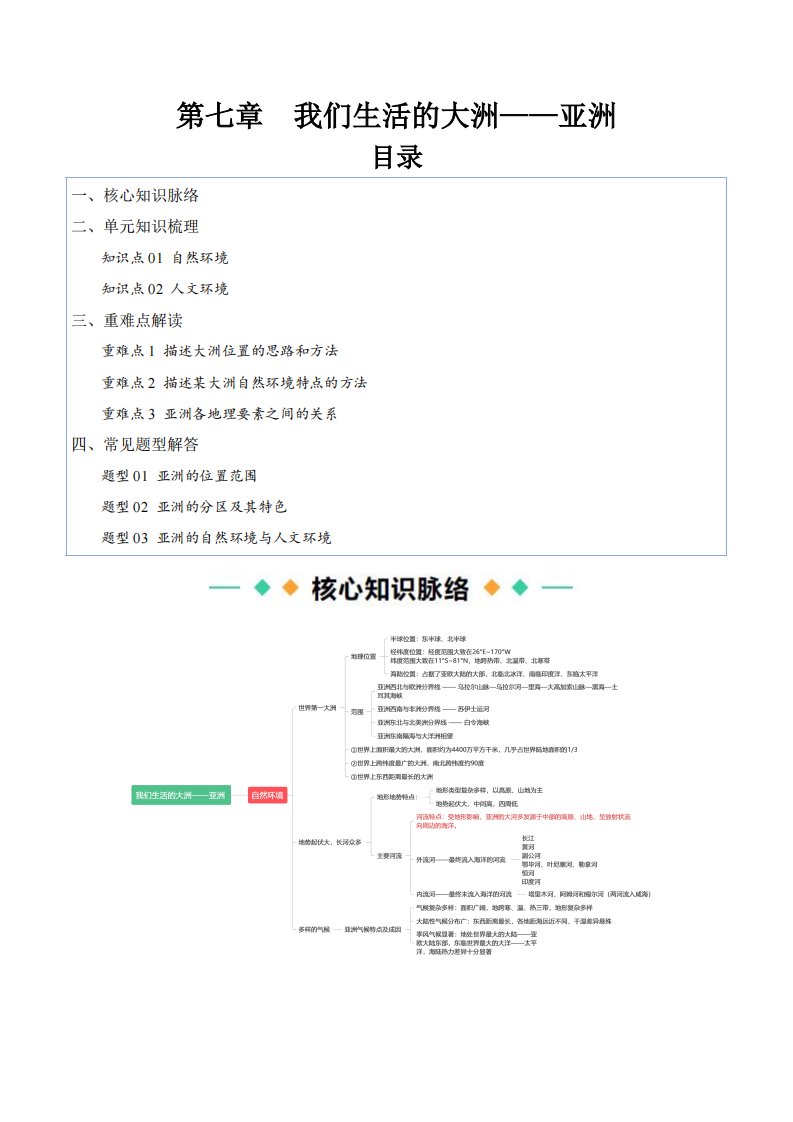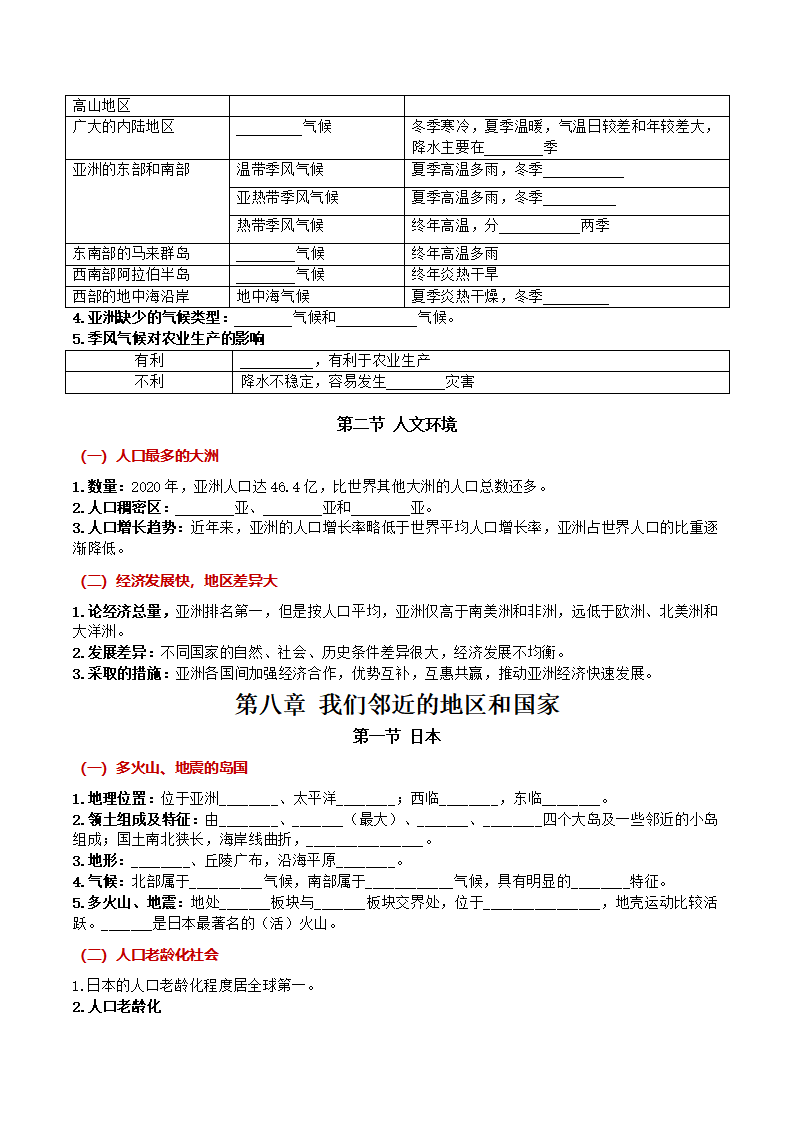 七下地理 第七章 我们生活的大洲——亚洲(知识清单)(含答案)QXDLRJ-0013