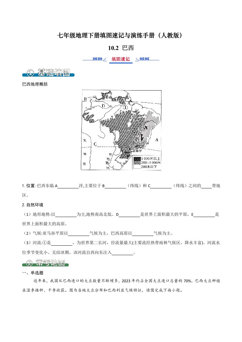 七下地理 10.2巴西(填图速记)-(人教版)(含答案)QXDLRJ-0065