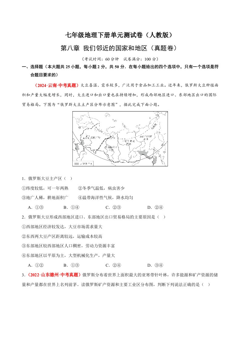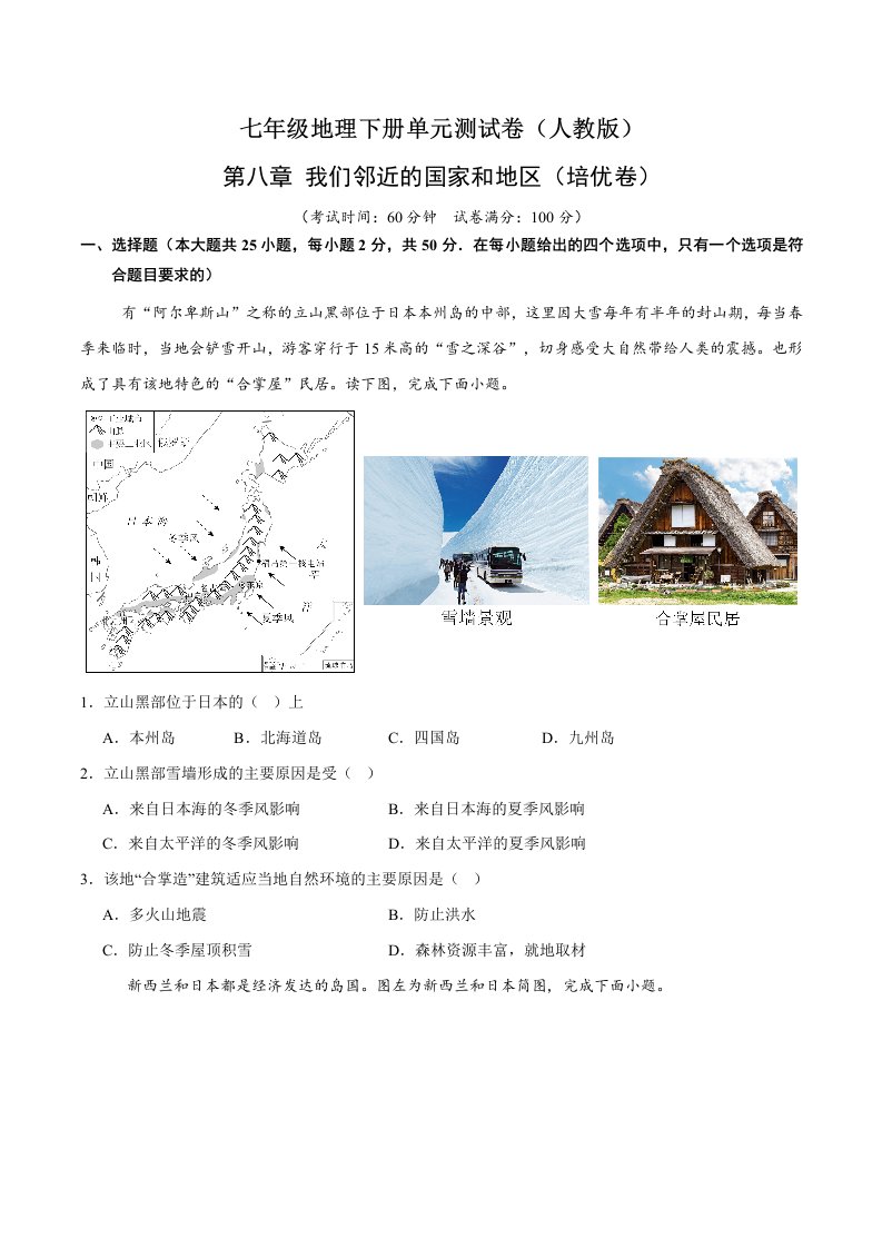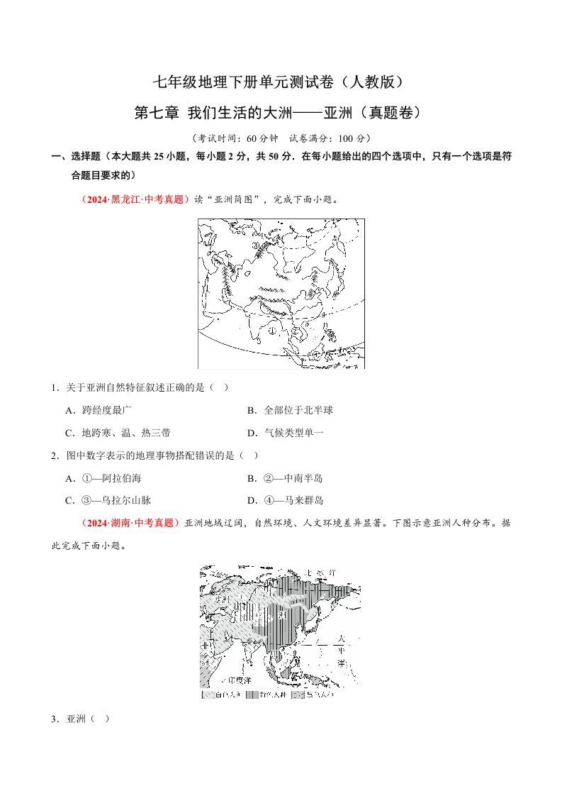 七下地理 第七章 我们生活的大洲——亚洲(含答案)QXDLRJ-0051