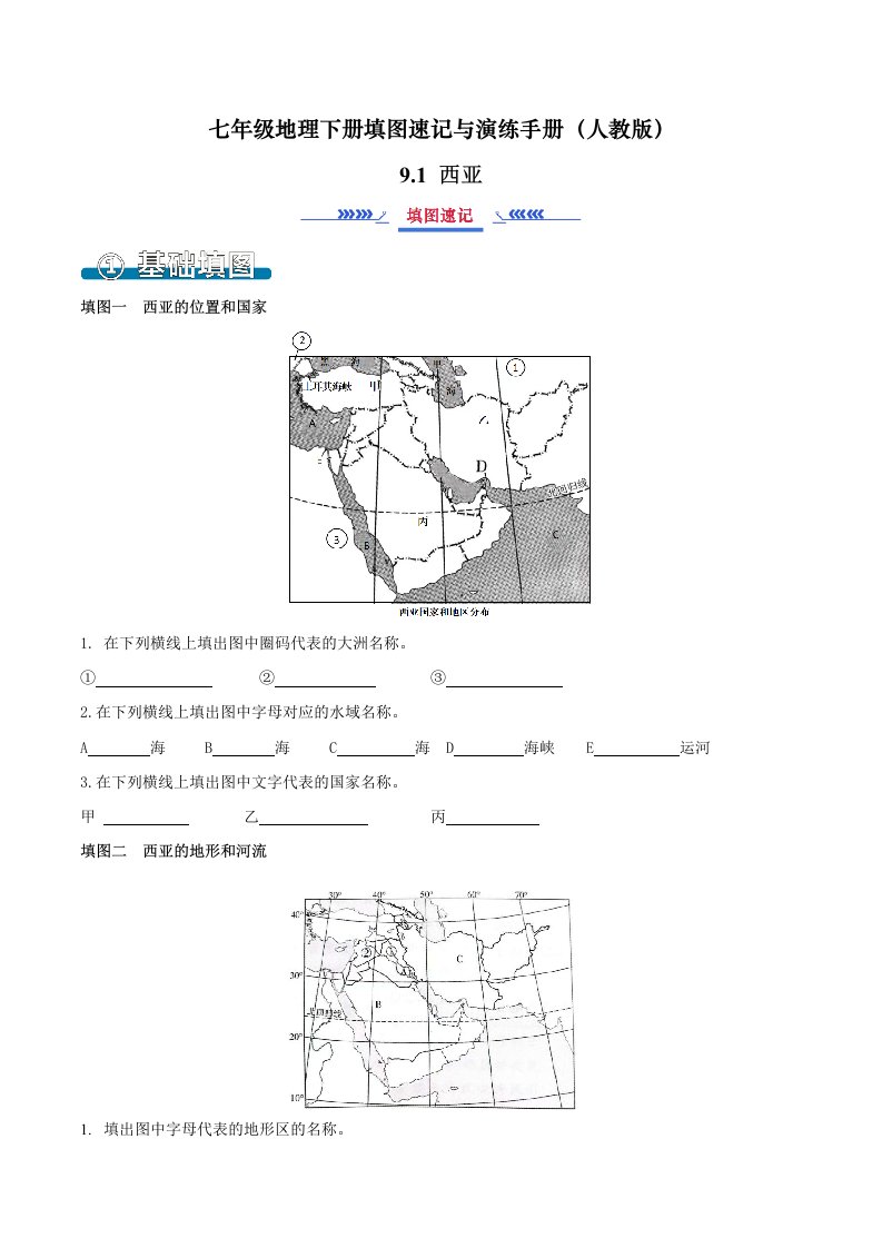 七下地理 9.1西亚(填图速记)-(人教版)(含答案)QXDLRJ-0079