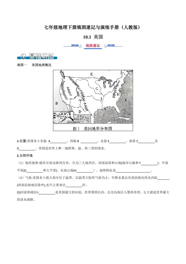 七下地理 10.1 美国(填图速记)-(人教版)(含答案)QXDLRJ-0063