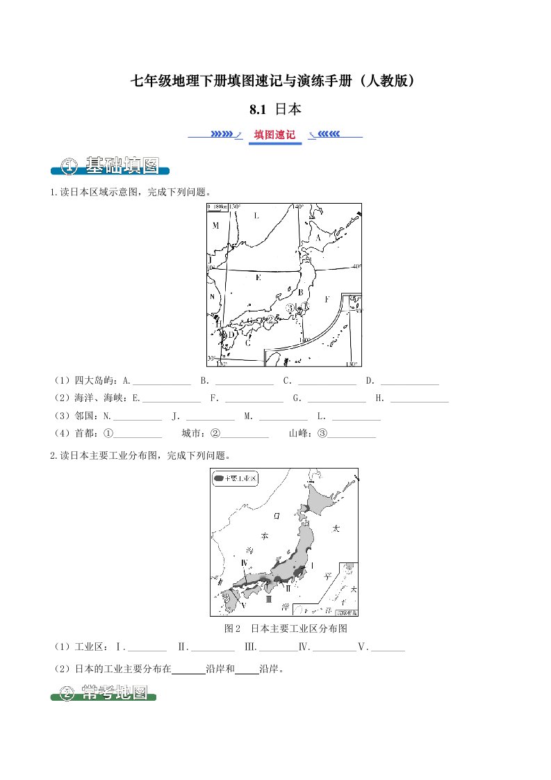 七下地理 8.1日本(填图速记)-(人教版)(含答案)QXDLRJ-0071