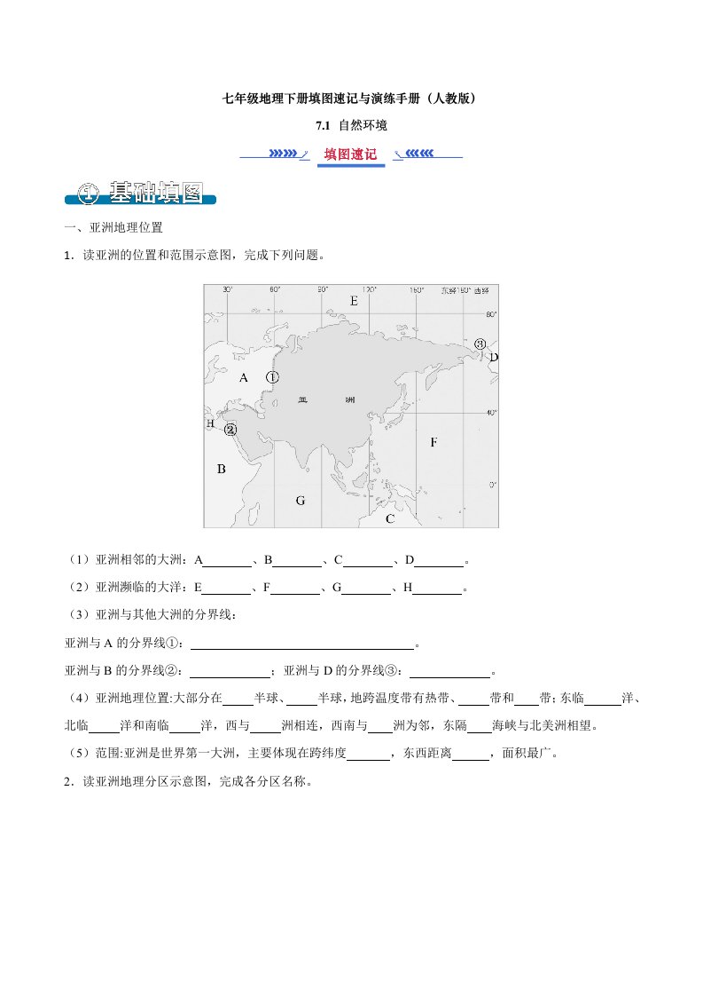 七下地理 7.1 自然环境(填图速记)-(人教版)(含答案)QXDLRJ-0069