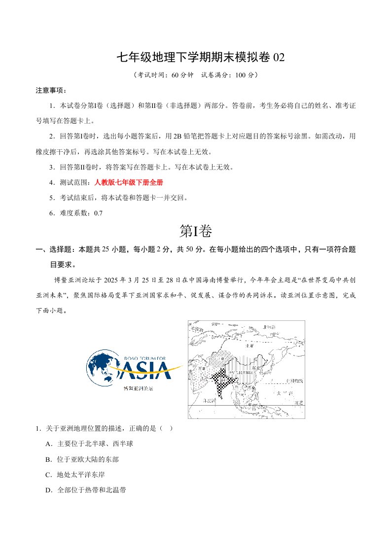 七年级下地理期末模拟卷02(含答案)QXDLRJ-0127