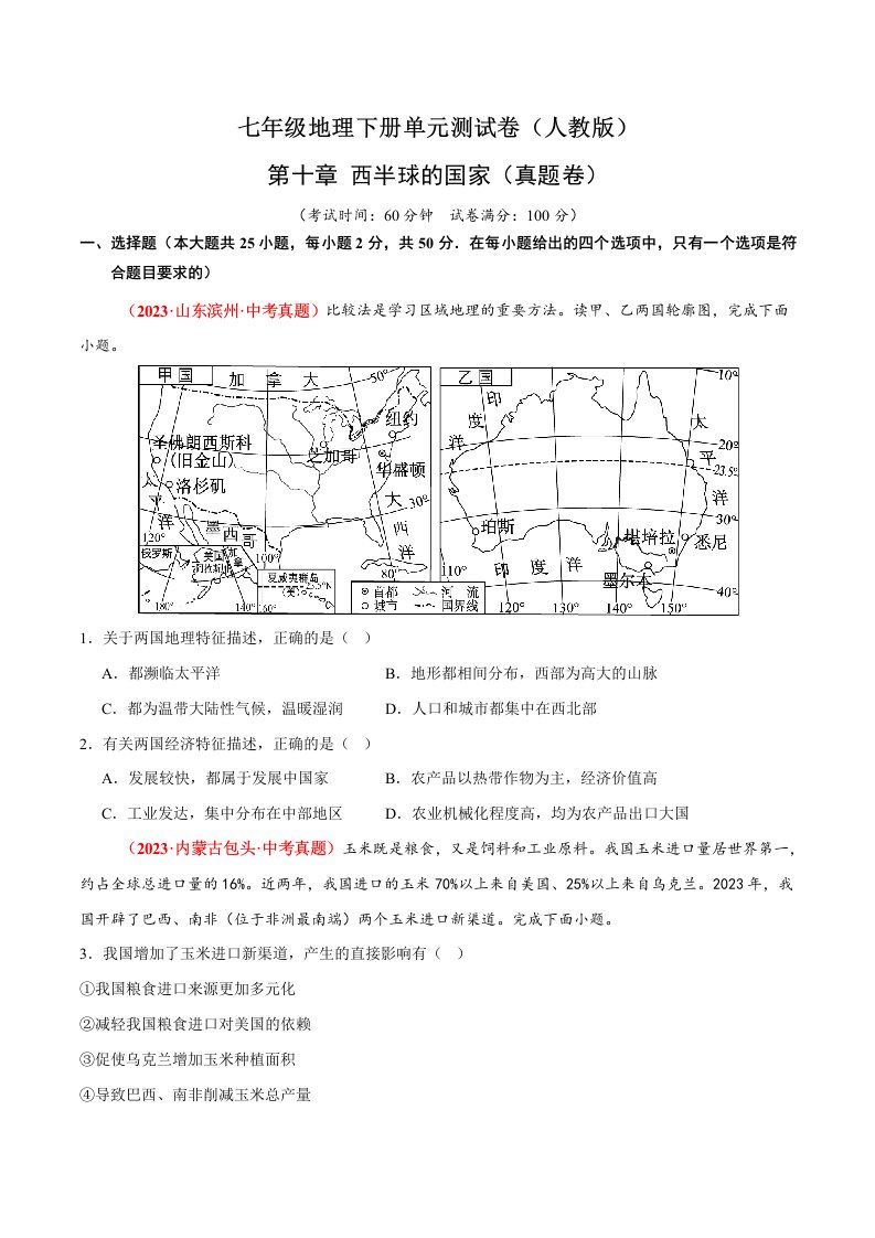 七下地理 第十章 西半球的国家(含答案)QXDLRJ-0059