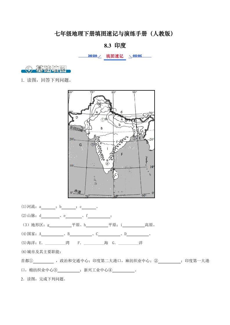 七下地理 8.3印度(填图速记)-(人教版)(含答案)QXDLRJ-0075
