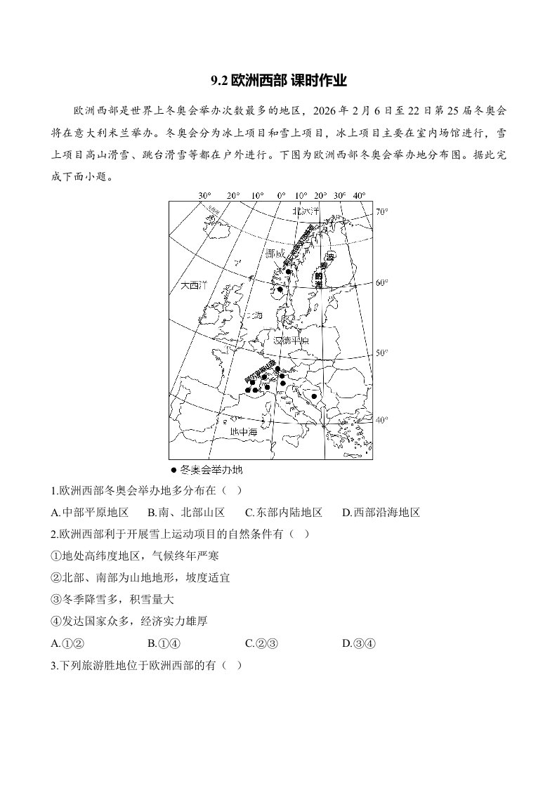 9.2欧洲西部 课时作业(含解析)七年级地理人教版(2024)下册QXDLRJ-0035