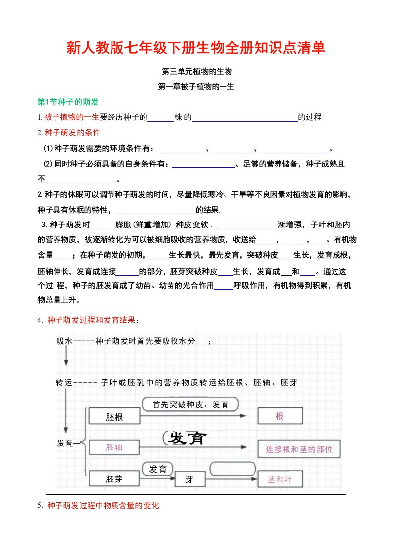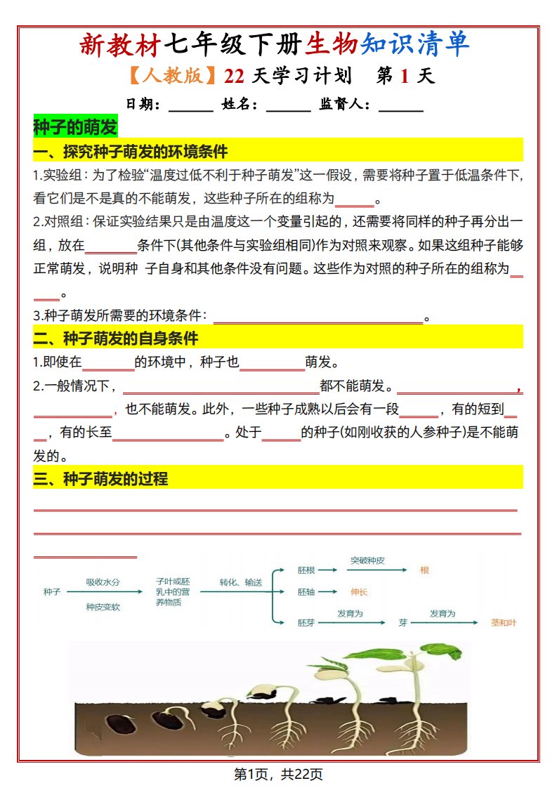 七年级下册生物知识清单(人教版)22天学习计划(含答案)QXSWRJ-0133
