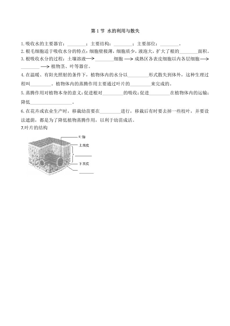 七下生物 第1节 水的利用与散失(含答案)QXSWRJ-0021