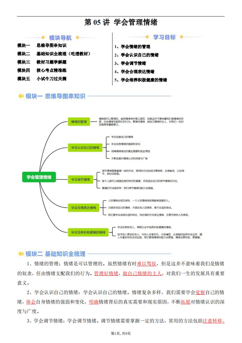 【七下道法】第05讲 学会管理情绪(寒假预习)(原卷版)(含答案)QXDFBB-0151