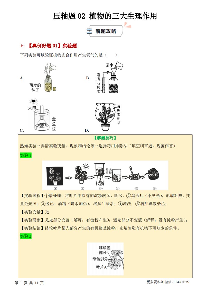 【七下人教生物】压轴题02 植物的三大生理作用(含答案)QXSWRJ-0095