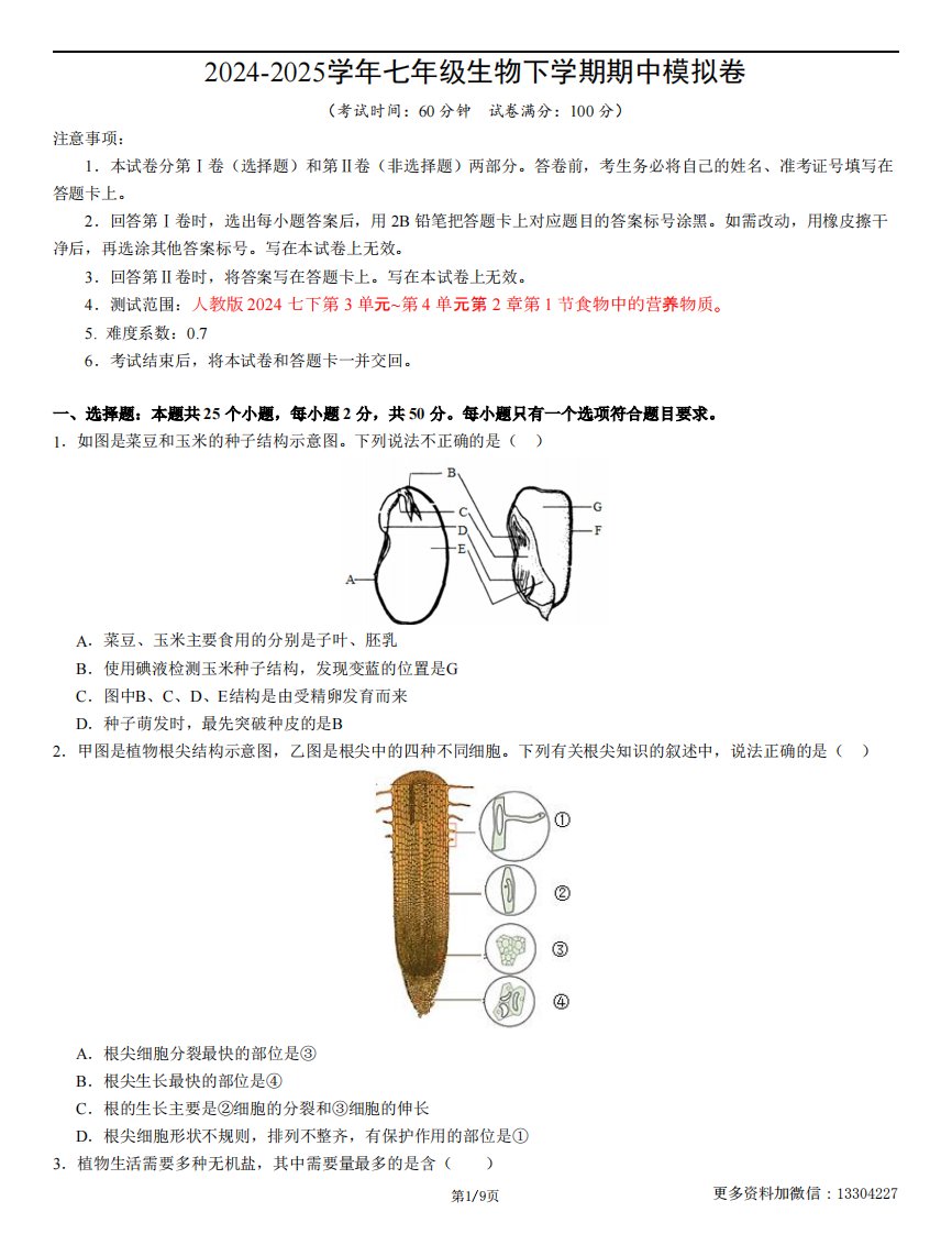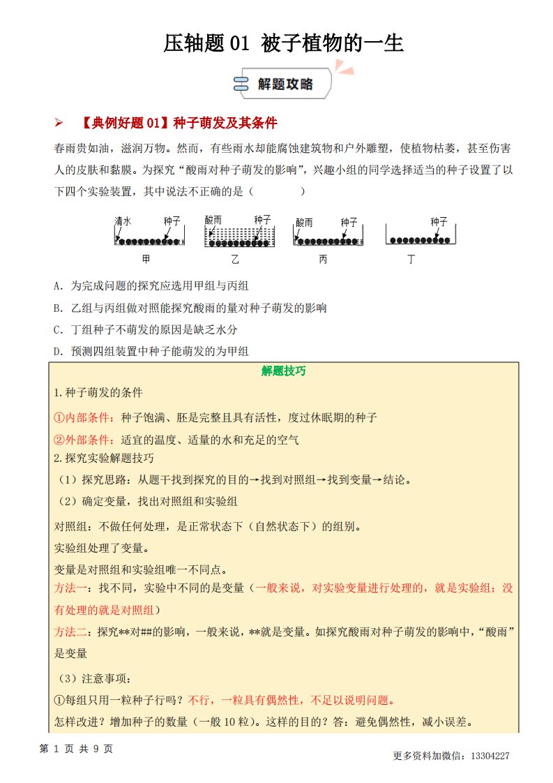 【七下人教生物】压轴题01 被子植物的一生(含答案)QXSWRJ-0093
