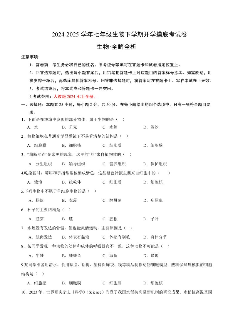 七年级下生物开学摸底考01(含答案)QXSWRJ-0111
