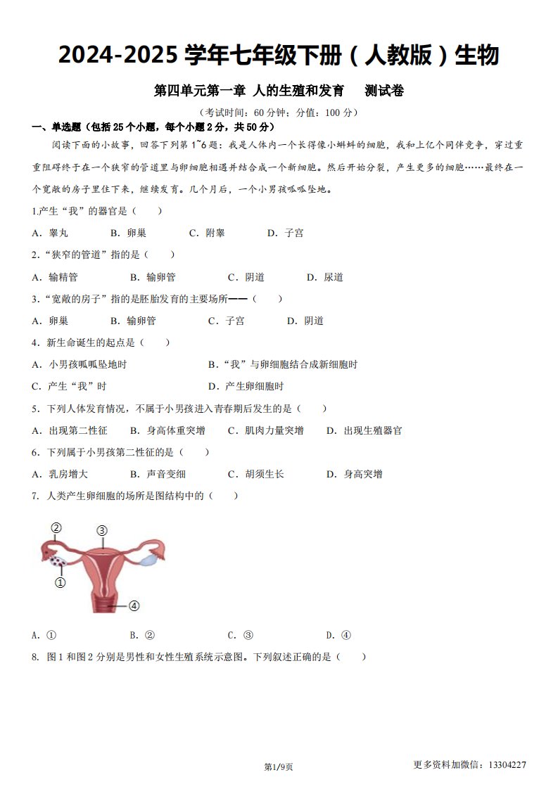 【七下人教生物】第四单元第一章 人的生殖和发育【单元卷·测试卷】(含答案)QXSWRJ-0086