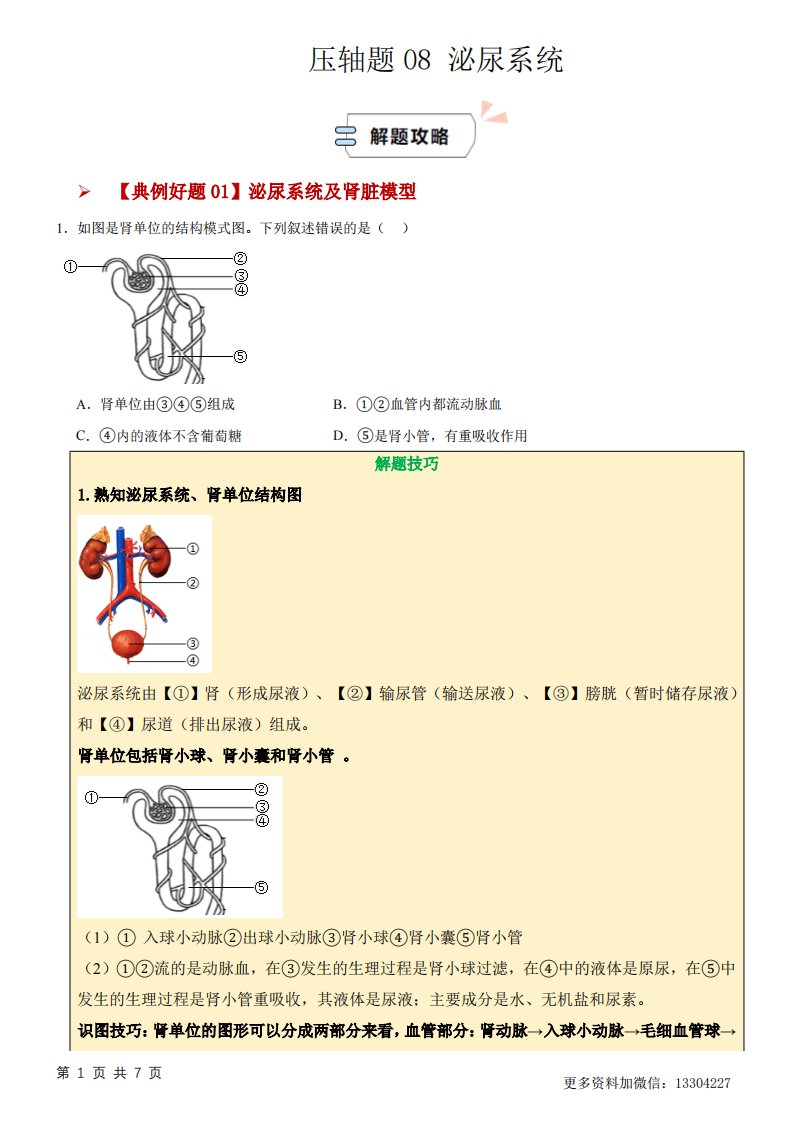 【七下人教生物】压轴题08 泌尿系统(含答案)QXSWRJ-0105