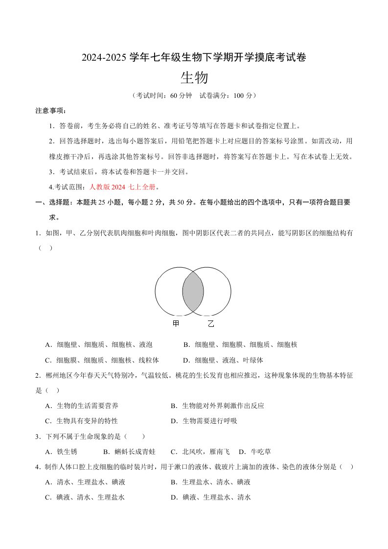 七年级下生物开学摸底考02(含答案)QXSWRJ-0116