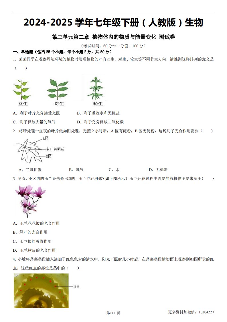 【七下人教生物】第三单元第二章 植物体内的物质与能量变化【单元卷·测试卷】(含答案)QXSWRJ-0084