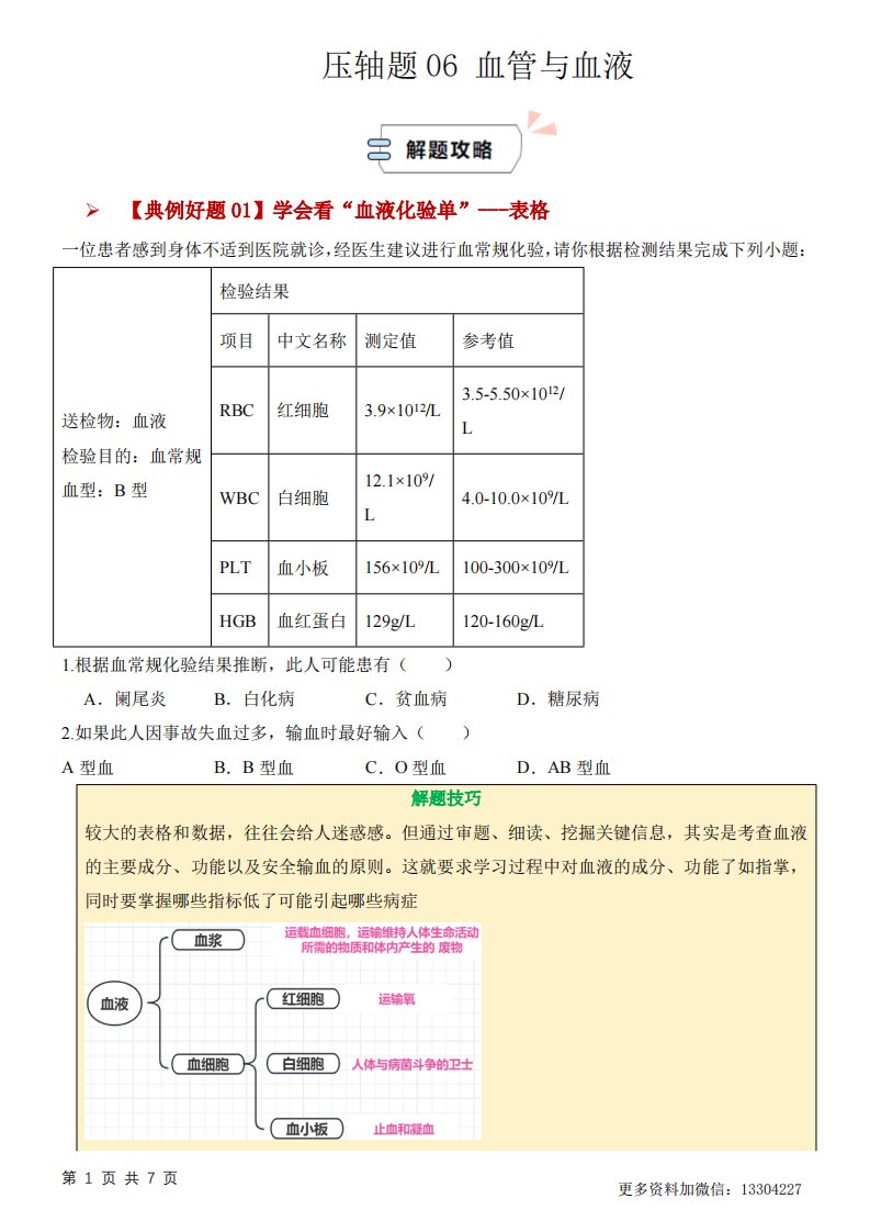 【七下人教生物】压轴题06 血管与血液(含答案)QXSWRJ-0101