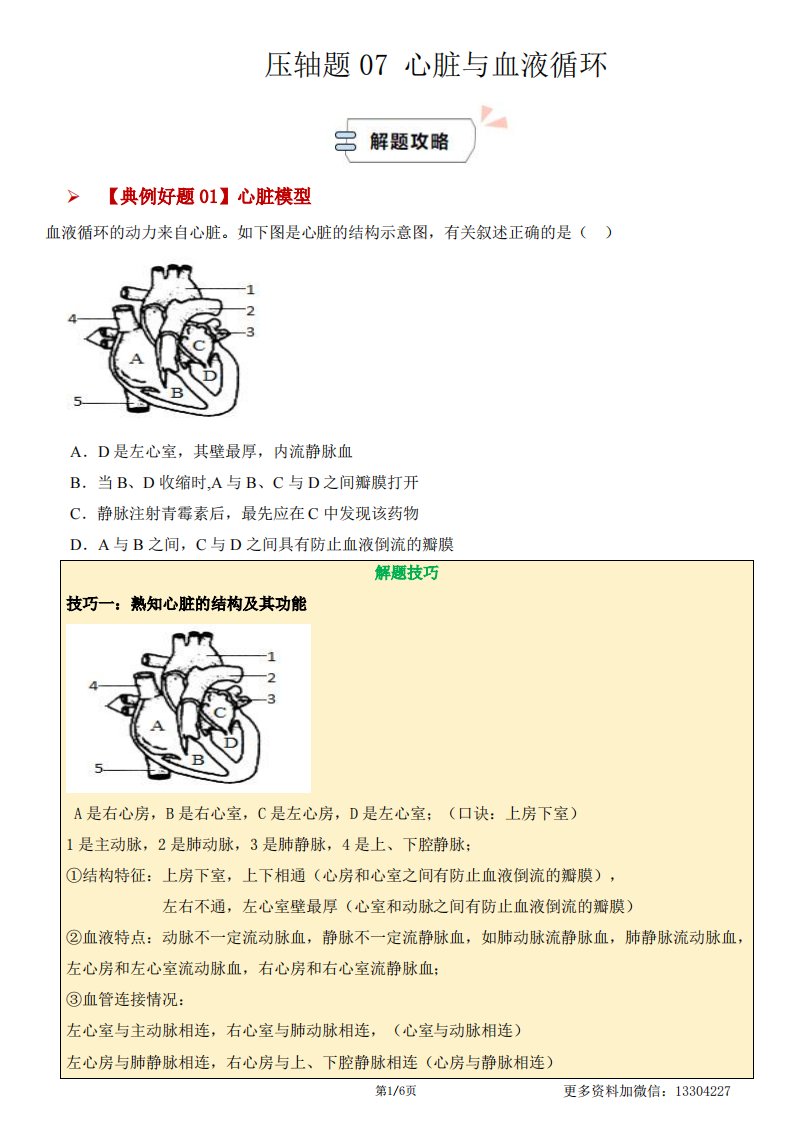 【七下人教生物】压轴题07 心脏及血液循环(含答案)QXSWRJ-0103
