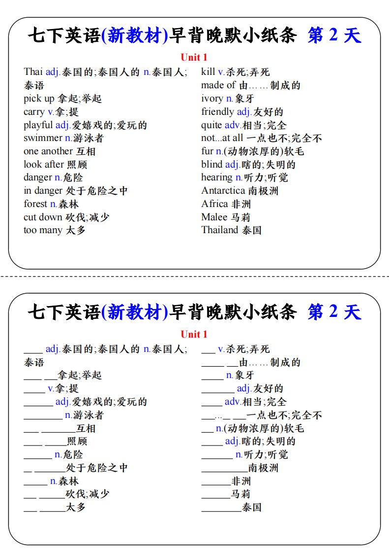 寒假预习-新人教版七下英语单词晨读晚默小纸条QXYYRJ-0311