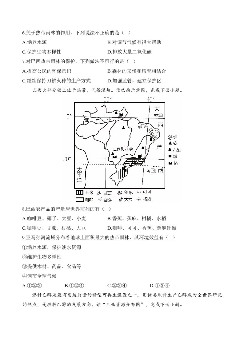 > 10.2巴西 课时作业(含解析)七年级地理人教版(2024)下册QXDLRJ-0026