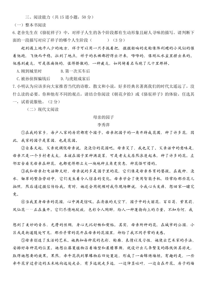 > 七下语文期中素养检测 - 学生版(含答案)QXYWBB-0228