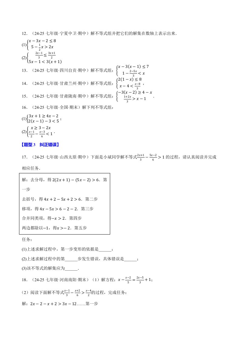> 七下数学专题11.5 一元一次不等式(组)的计算五大题型分类训练(50题)(人教版)(含答案)QXSXRJ-0090