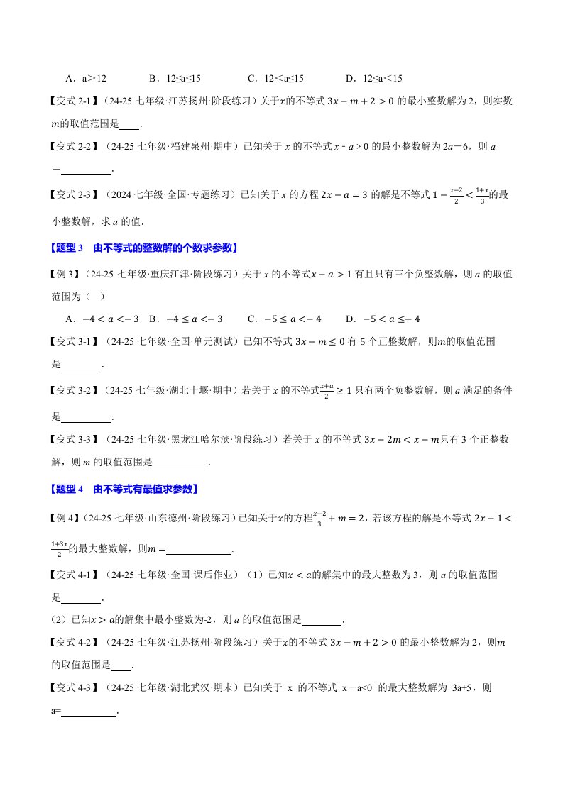 > 七下数学专题11.6 一元一次不等式(组)中的含参问题(十三大题型)(人教版)(含答案)QXSXRJ-0092