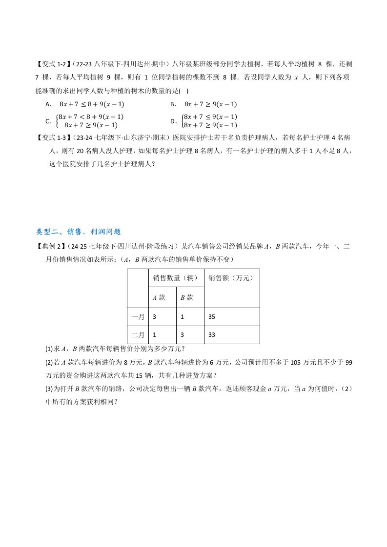 > 七下数学专题09 一元一次不等式组的应用压轴汇编(四大类型)(含答案)QXSXRJ-0198