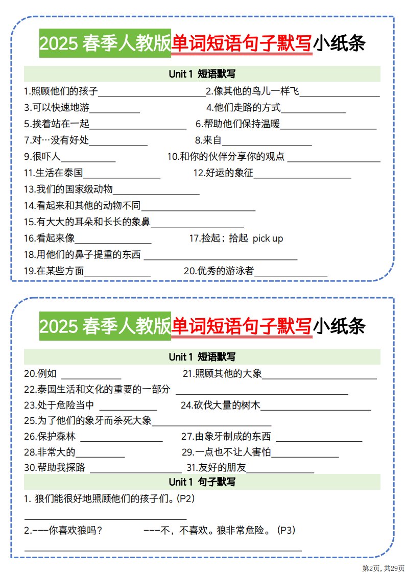 > 七下英语 人教版单词短语句子默写小纸条【含答案】QXYYRJ-0179