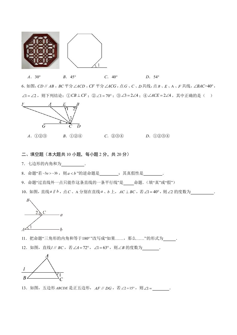 七下苏科数学 第12章 定义 命题 证明(单元重点综合测试)(含答案)QXSXSK-0076