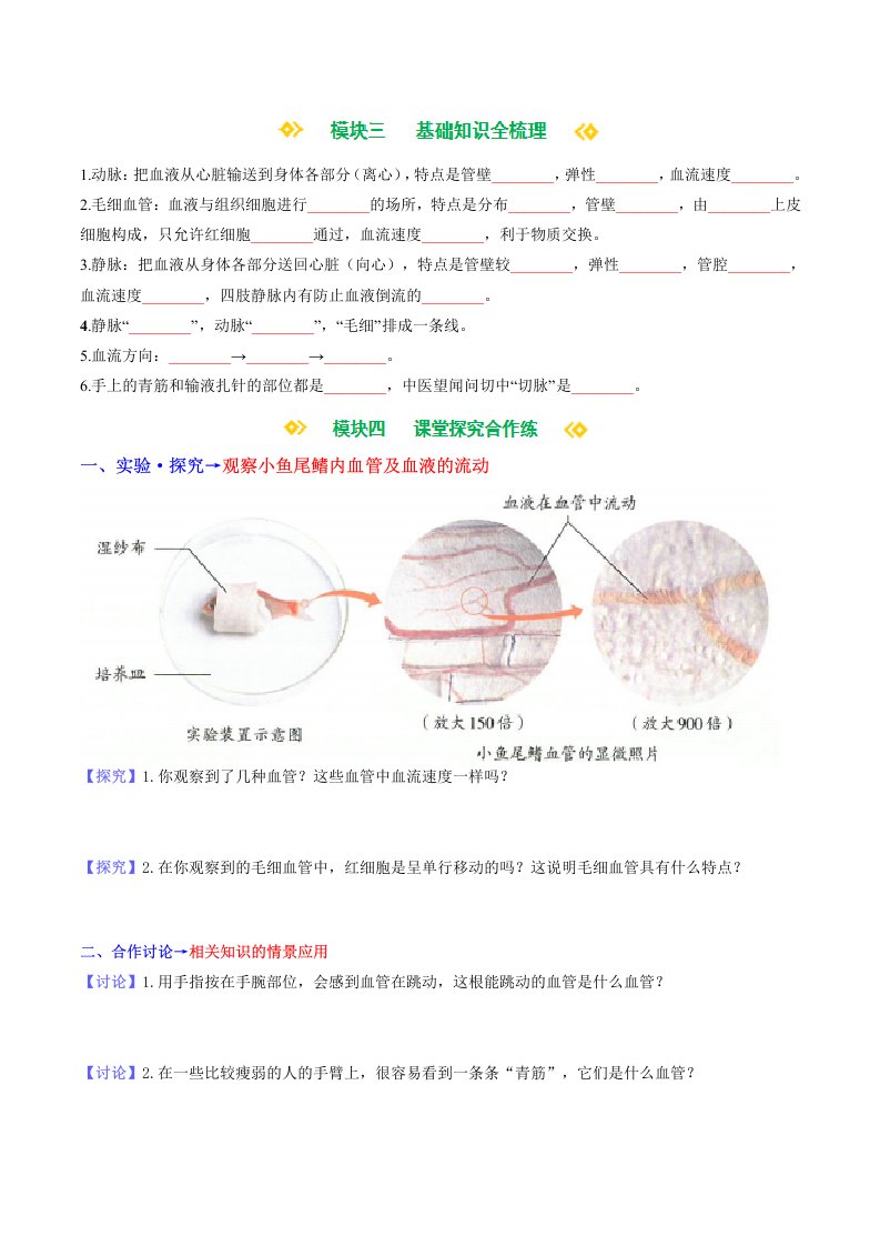 > 七下生物 4.4.2 血流的管道—血管(含答案)QXSWRJ-0075