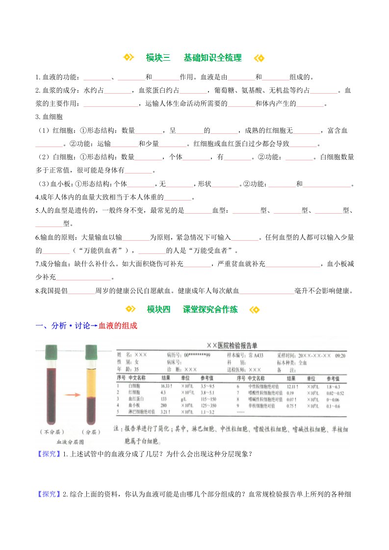 > 七下生物 4.4.1 流动的组织—血液(含答案)QXSWRJ-0073