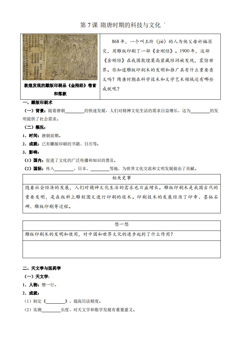 新七下第7课 隋唐时期的科技与文化(含答案)QXLSBB-0093