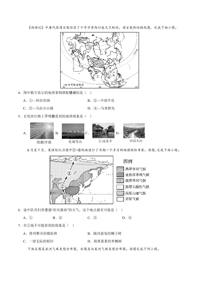 七年级下地理月考卷02【测试范围:人教版2024第七~八章第二节】(含答案)QXDLRJ-0095