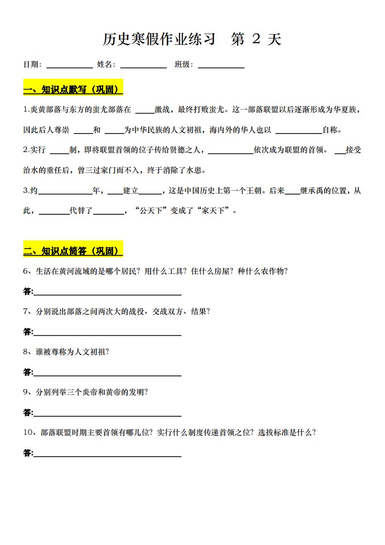 七年级下 历史寒假作业练习(含答案)QXLSBB-0060